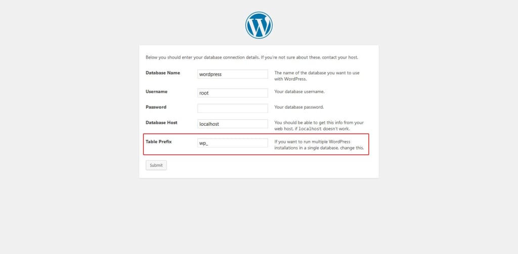 We need to enter all the details related to the database here only thing we need to change is Table Prefix. By default, the WordPress table prefix is (wp_). We can change it according to our requirements like below.